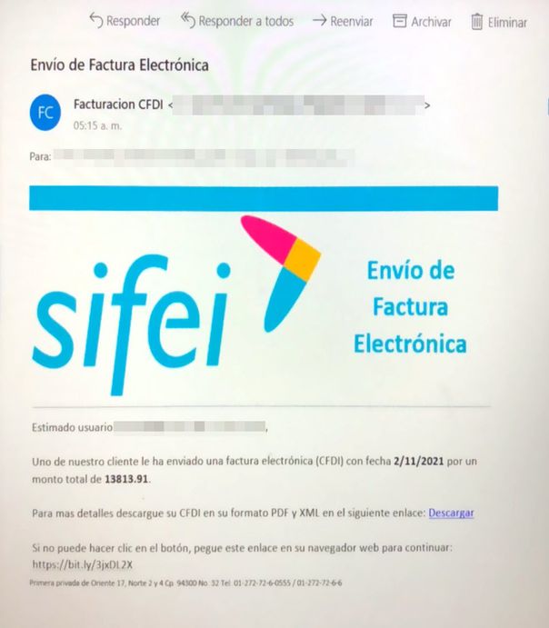 En la campaña identificada, el correo tiene como asunto: «Envío de Factura Electrónica». En el mensaje se informa que se ha enviado una supuesta factura electrónica, y por ello, se invita al usuario a que la descargue. Los correos contienen un enlace que simula ser del área de clientes de Sifei, y una vez que el usuario ha clicado sobre el enlace, este es redirigido a una página web maliciosa donde se descargará el malware. El nombre del archivo maliciosos es: